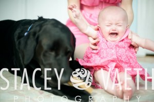 I arrive. Mom and I create a space on the floor for dog and baby. We move the rug, adjust the lights. The camera gets drawn out of the bag. The dog gets bribed with his bone. The baby gets lowered into place….and!