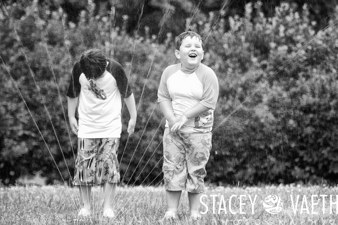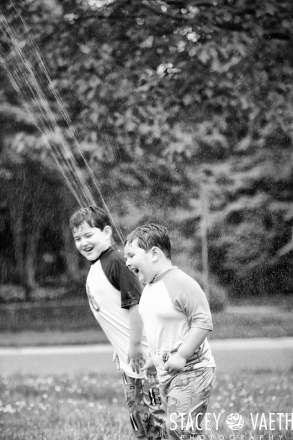 Neither misty skies nor our super-early start deterred Kelly’s boys from jumping right in to their first sprinkler photo session! What a blast.